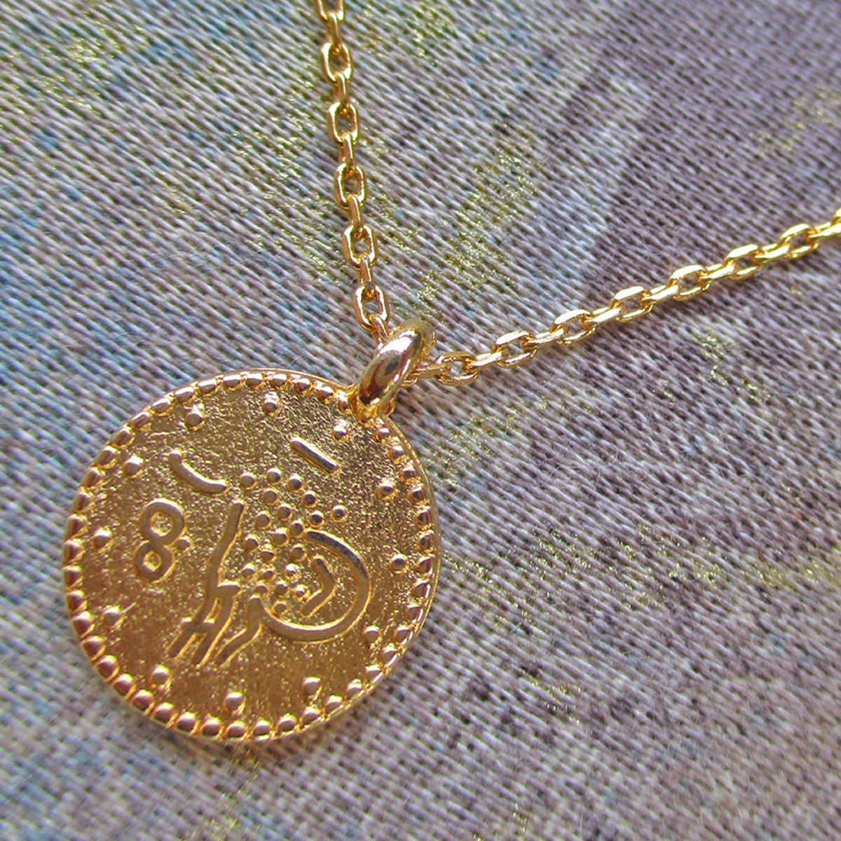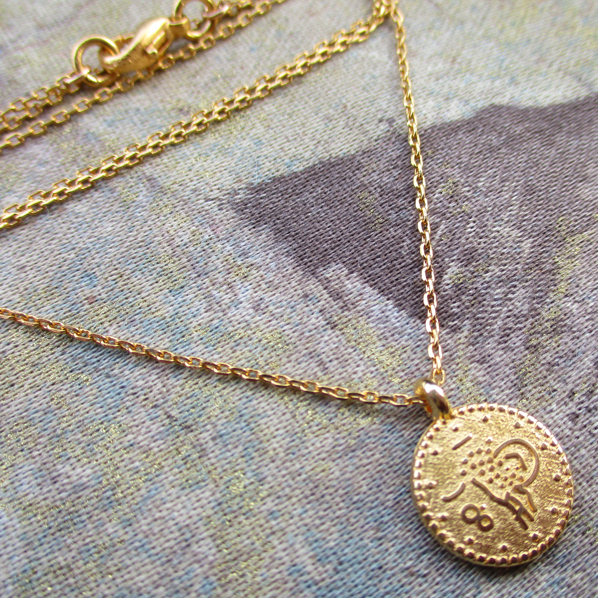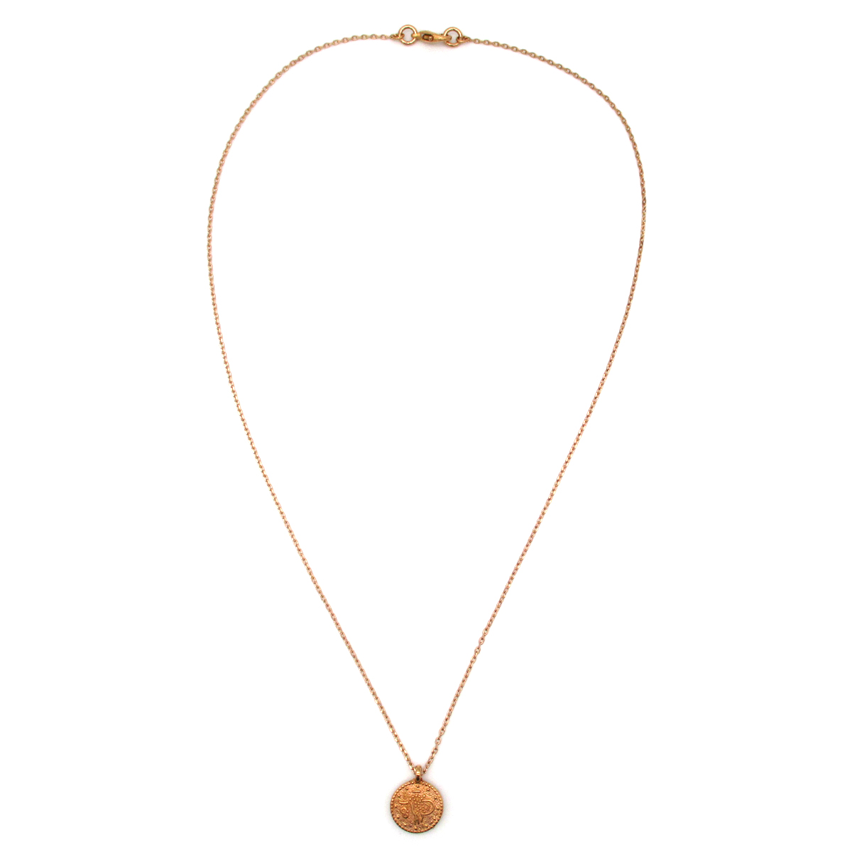 Gold plated chain necklace with coin charm, 40 cm plus 2 extensions of 5 cm. Charm 1.2 cm diameter.