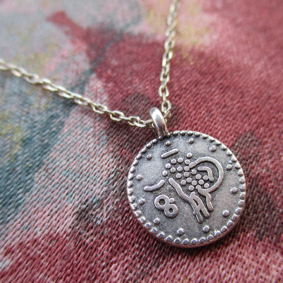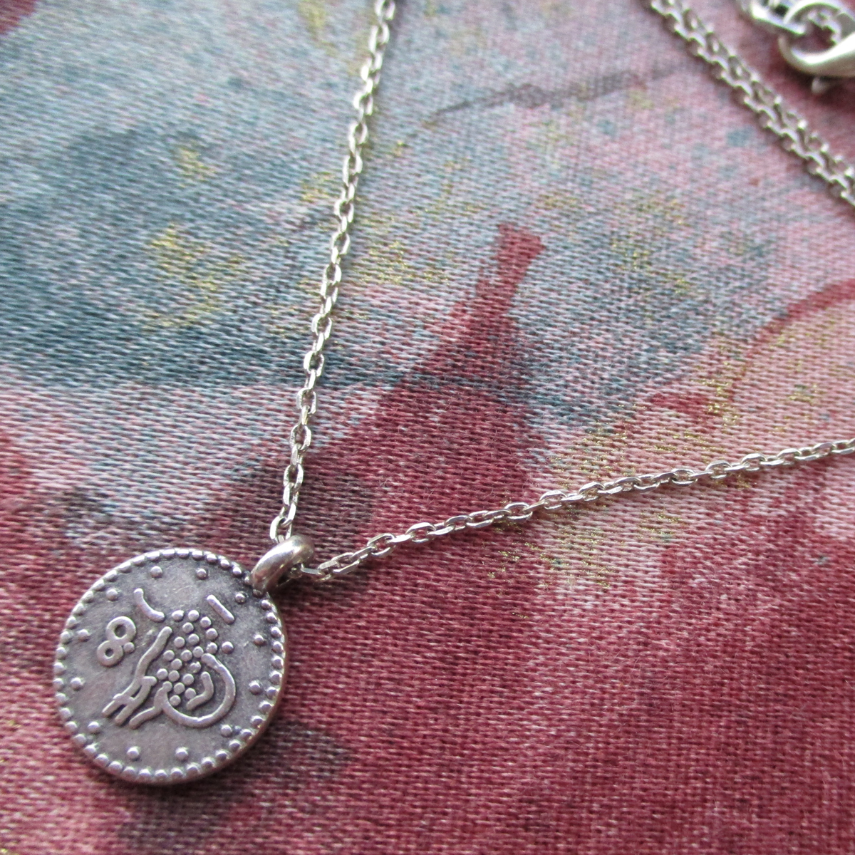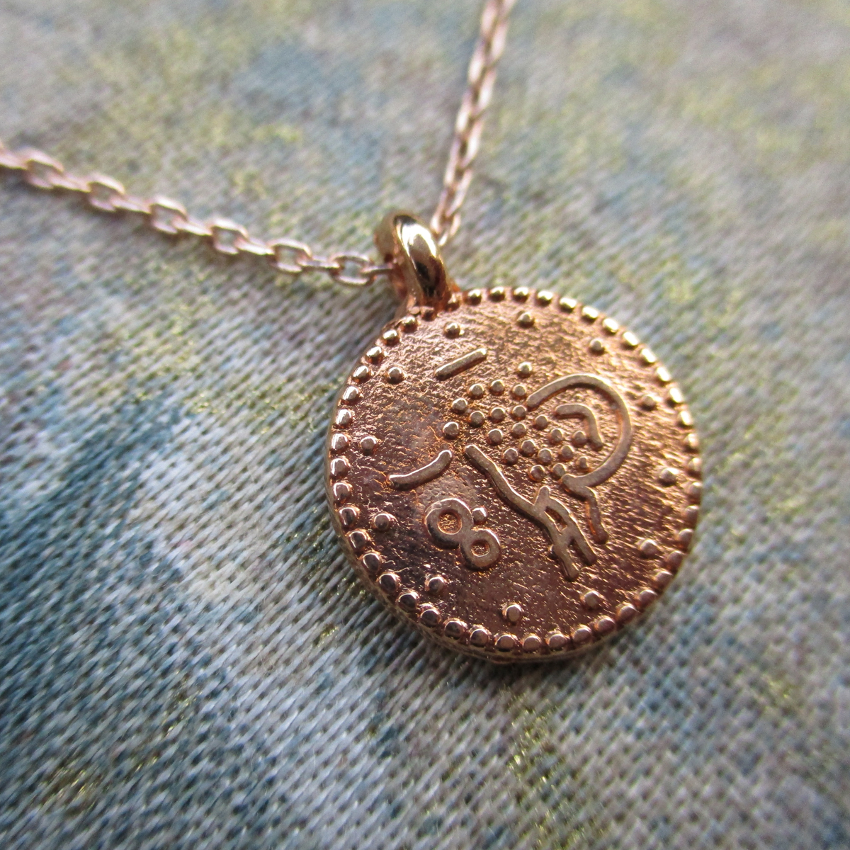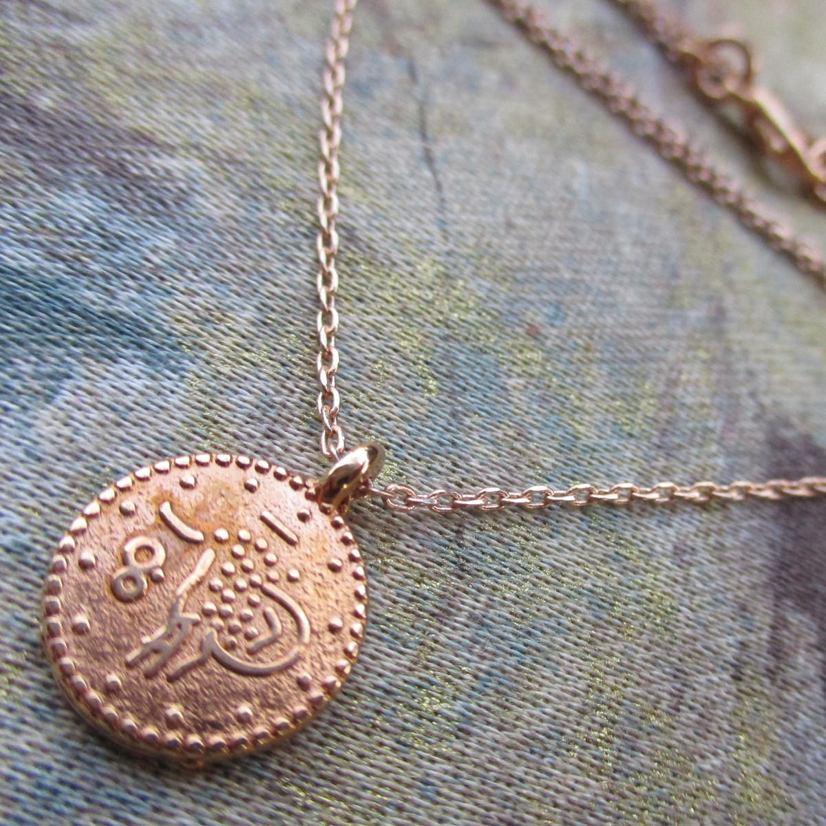 Gold plated chain necklace with coin charm, 40 cm plus 2 extensions of 5 cm. Charm 1.2 cm diameter.