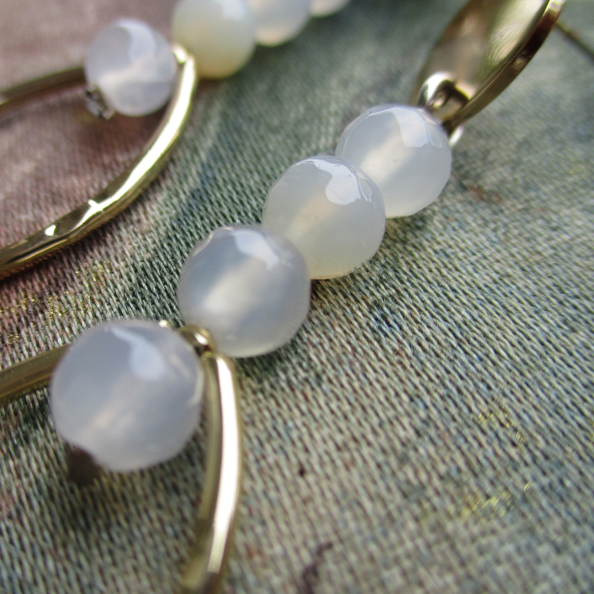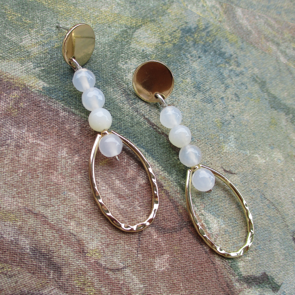 Echo was an Oread who lived on Mount Cithaeron, in Greek mythology. She is the inspiration for this delicate design. A pair of earrings unlike others. A shiny gold-plated stud with a drop made up of four beige opal beads. Attached to a hammered style oval shape. A classic piece of jewellery for you.