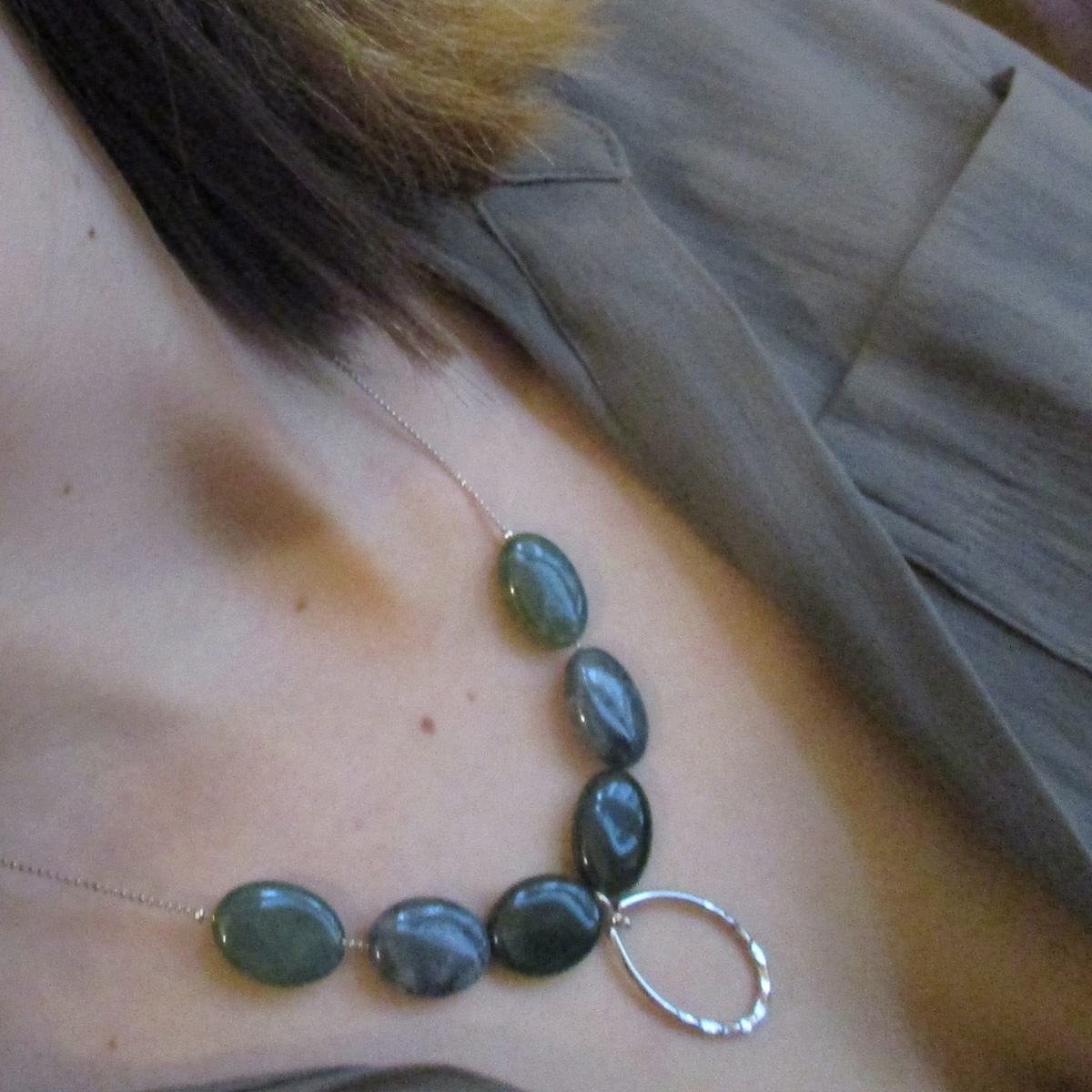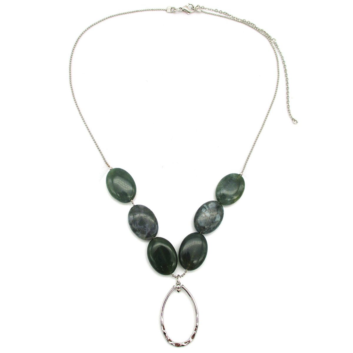 In Greek mythology, Gaia is the personification of the Earth and the ancestral mother of all life. She is the inspiration for this uncommon design where six oval flat shaped moss agate beads give the gravity is needed to form a perfectly shaped Y silver necklace.