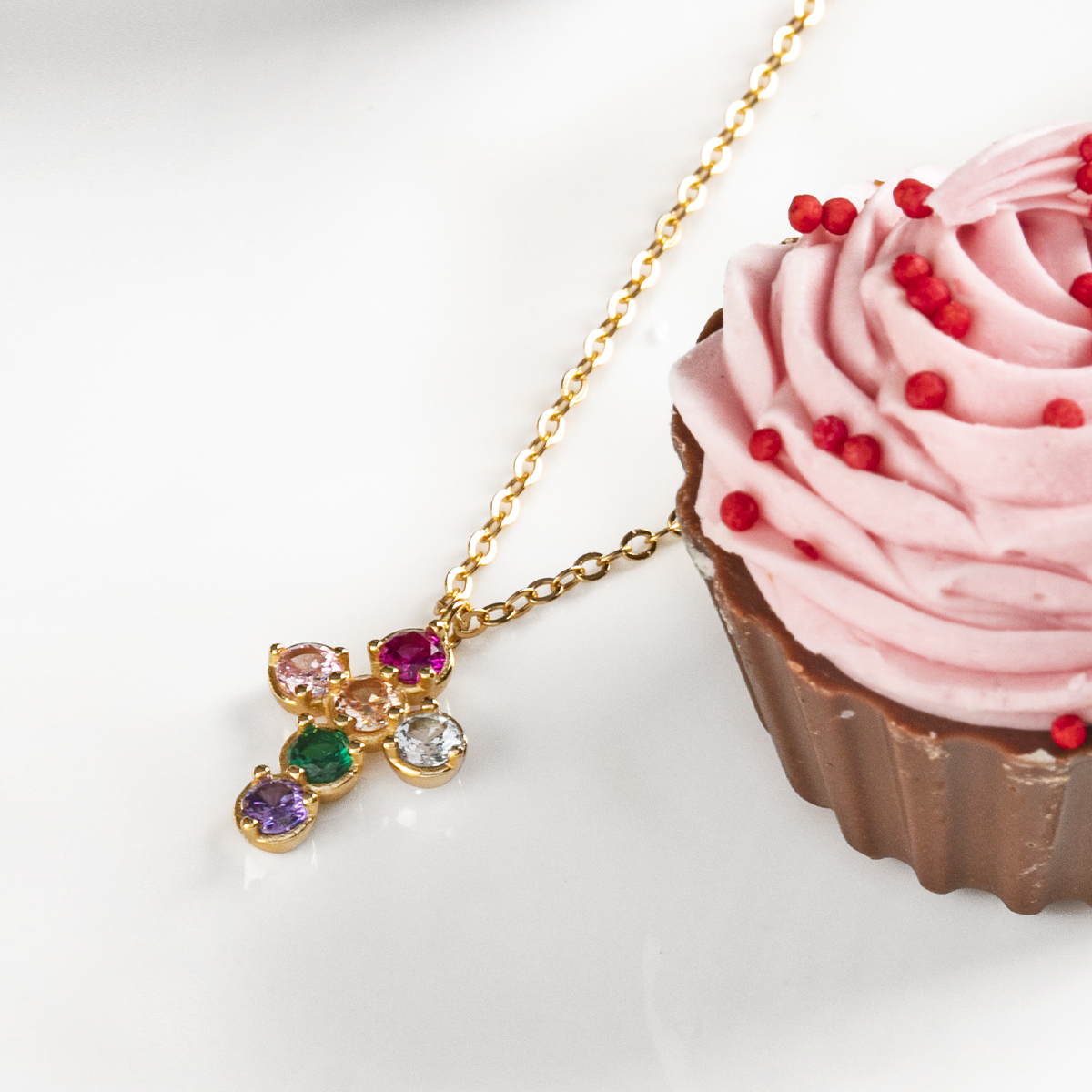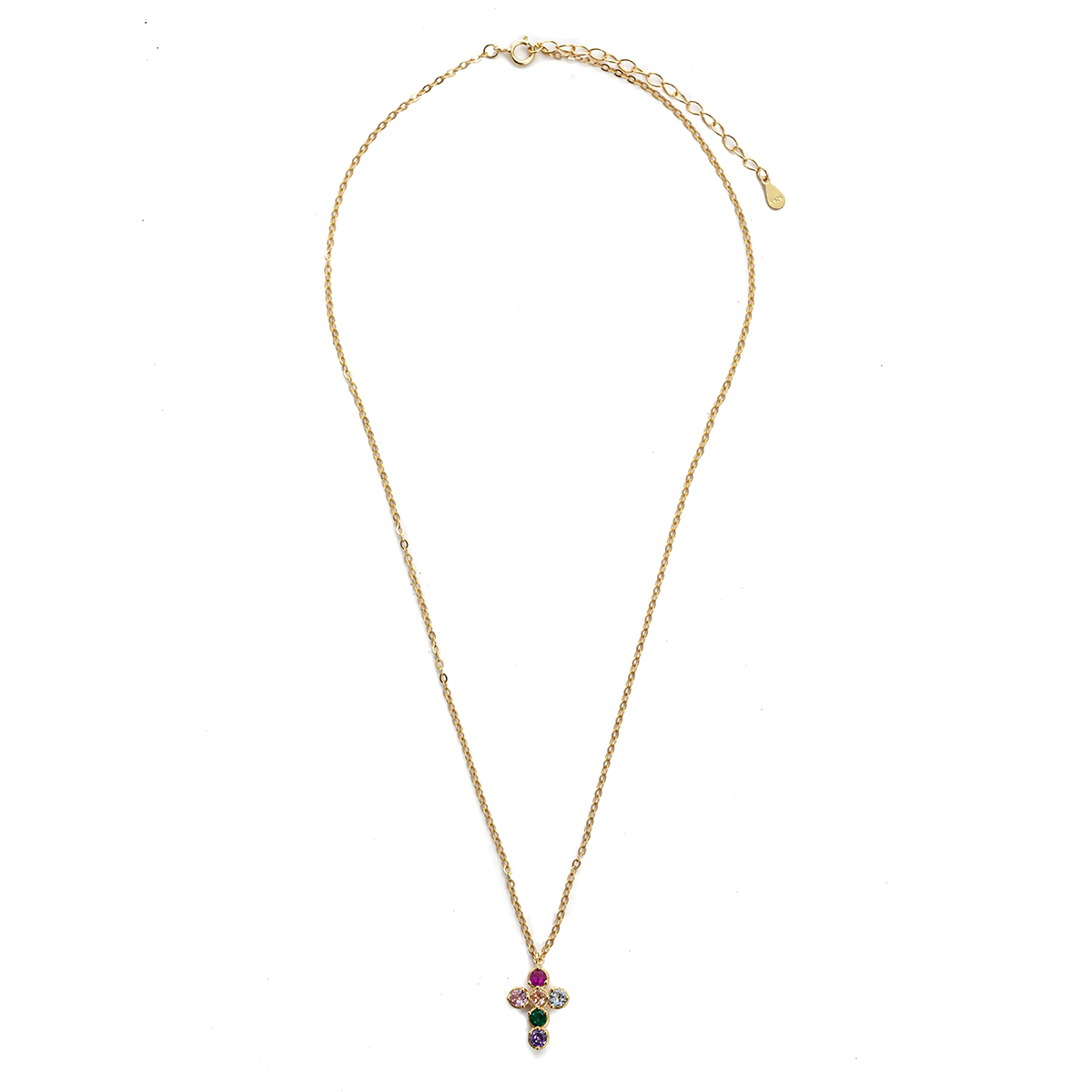 Zircon after zircon and color after color, this cross necklace became more than an ornament, a symbol of unity and elegance. Made of 925 gold-plated silver. Necklace length 40 cm, plus 5 cm extension. Cross 17.5 x 12 mm.