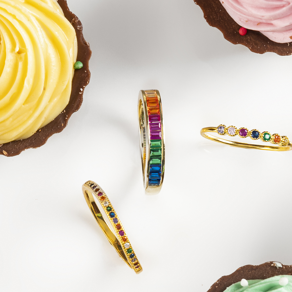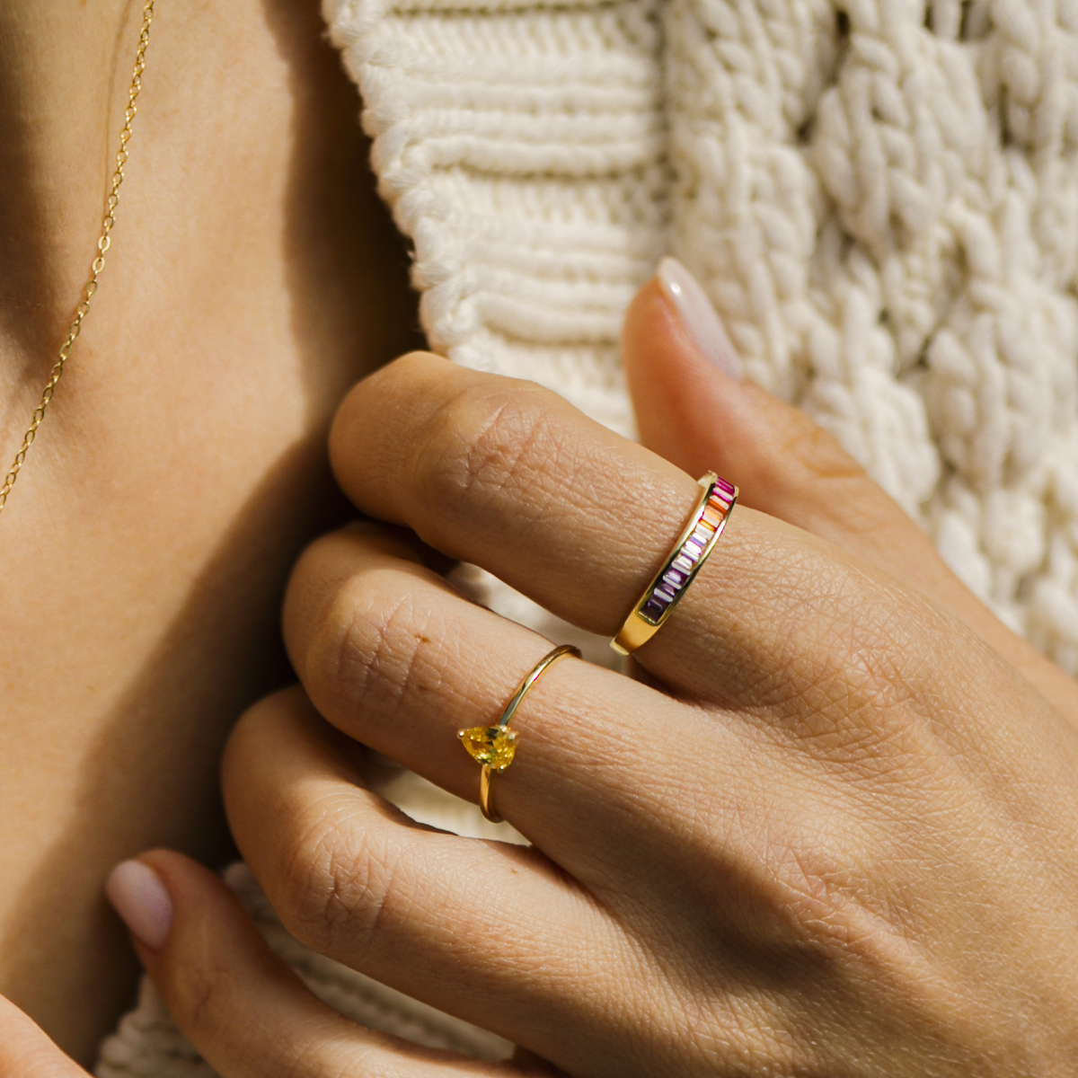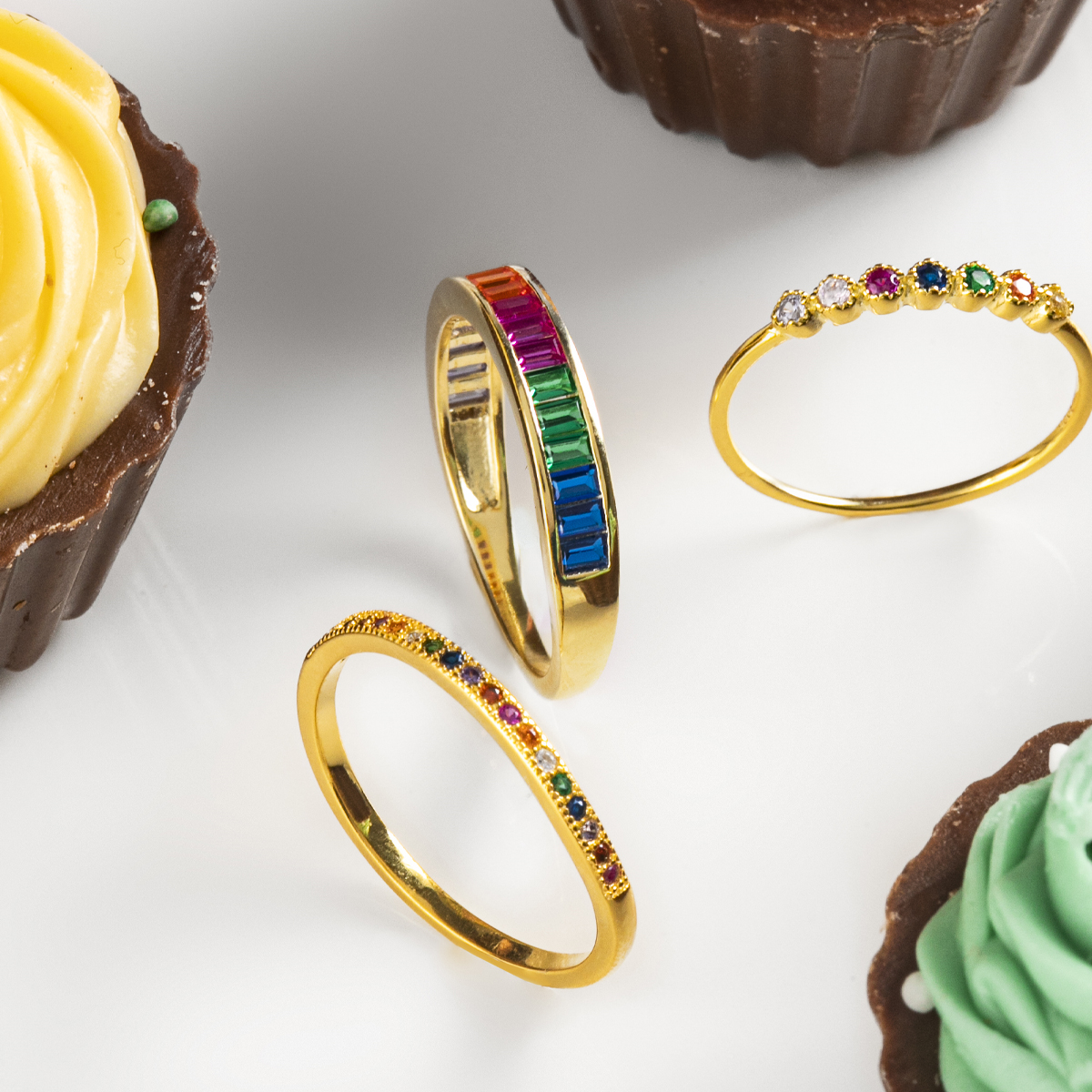 Born to steal hearts, this half eternity ring with its fancy square-shaped zircons, analyzes the light, in so many heavenly colors. For all the significant ladies and misses. Made of gold-plated 925 silver, available in two sizes.