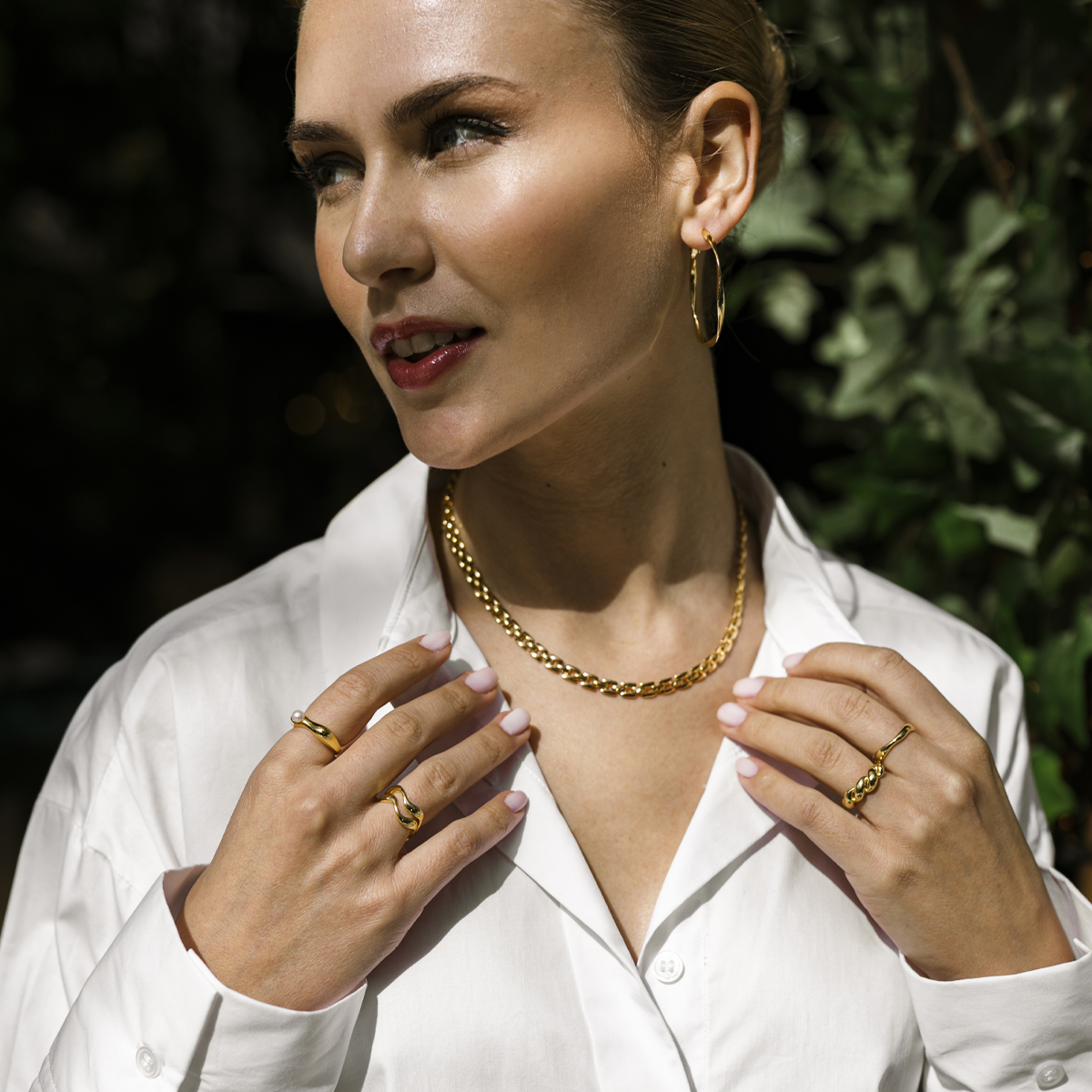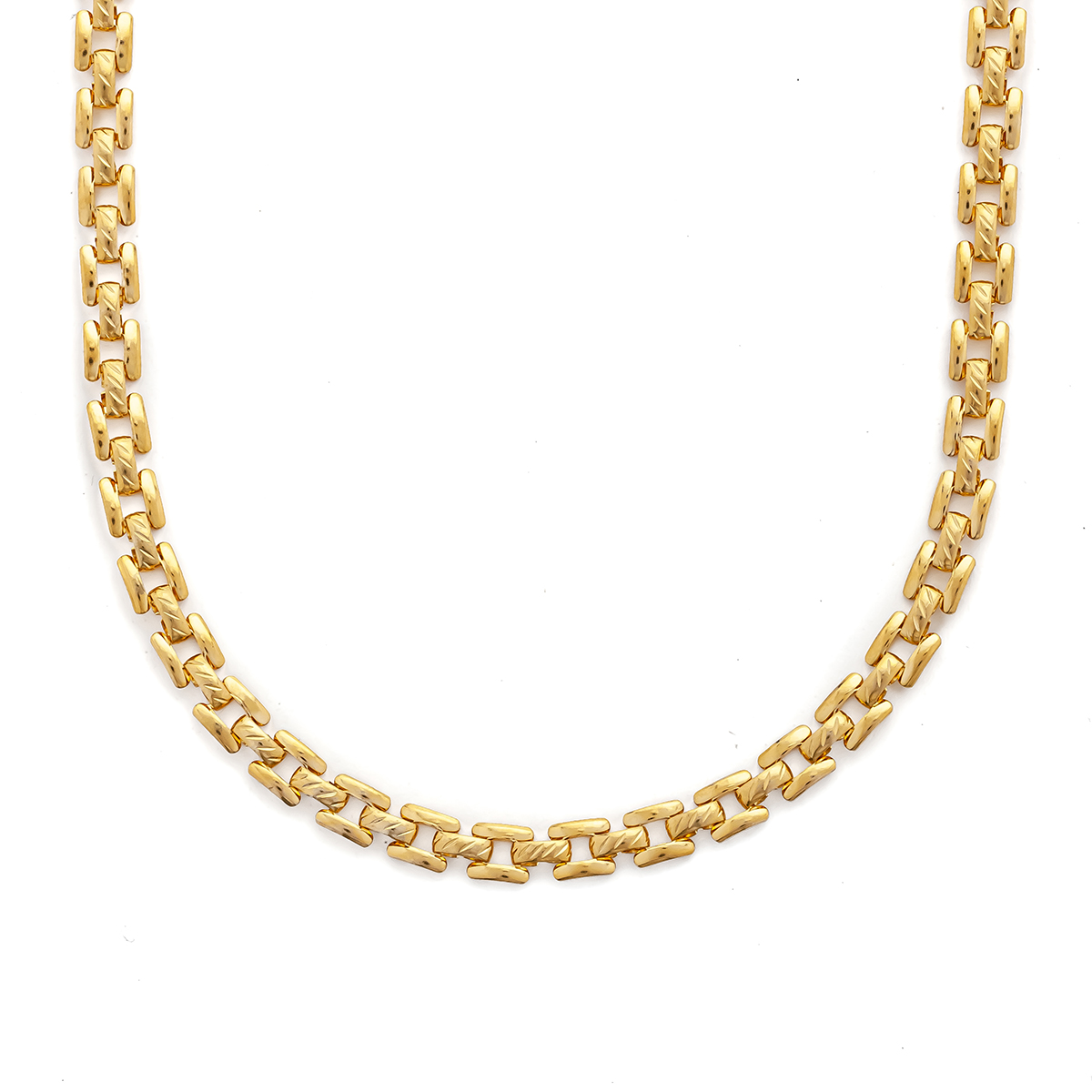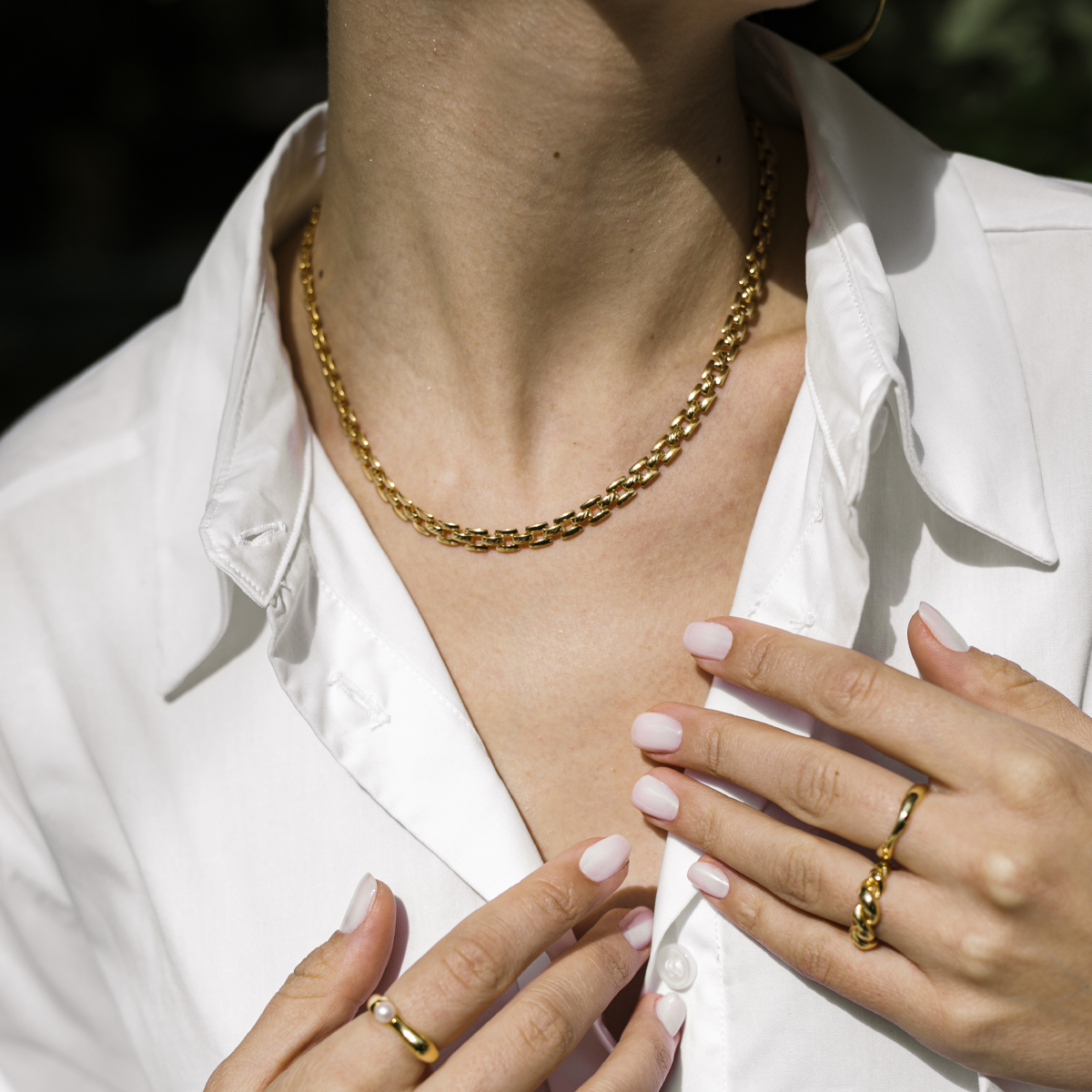 A chain necklace with a bracelet closure that wraps your neck with another comfort. Made of gold-plated stainless steel. Also available as a matching necklace.