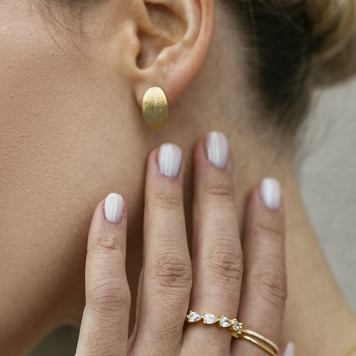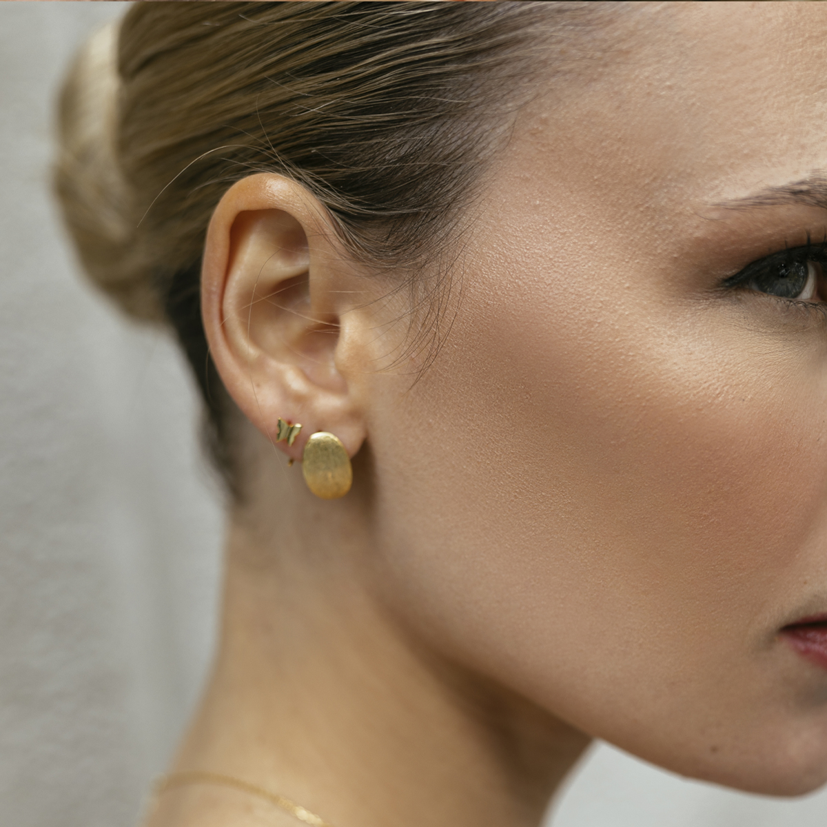 Don’t get despaired. A pair of hammered curved stud earrings find the solution again. Made of 925 gold-plated silver with a butterfly clasp. Dimensions 9.7 x 15 millimeters. Sold as a pair.