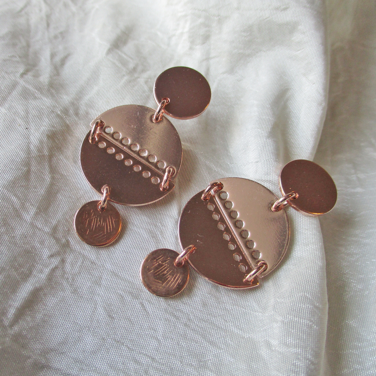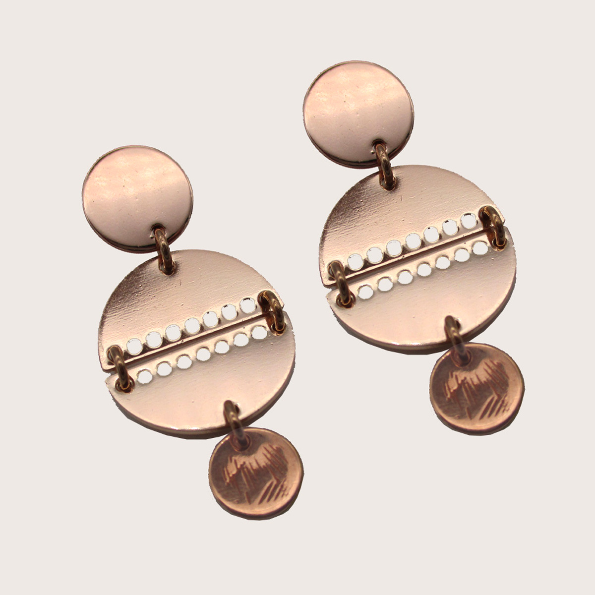 Narcissus, the one who fell in love with his own reflection, in Greek mythology. He is the spirit behind this design. Two rose gold semi-circles form a shiny mirror charm. An abstract coin is attached to the mirror charm as layering.