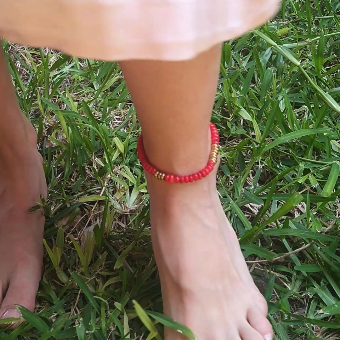 Red coral rings partner with gold hematite rings in this bold ankle bracelet. With gold-plated stainless steel clasp and extension chain, is completely water resistant.