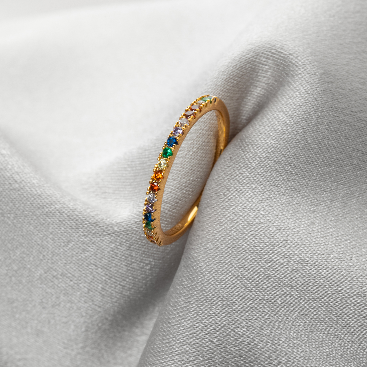 Gold plated eternity ring with multi colored zircons. Available in ring size 7.