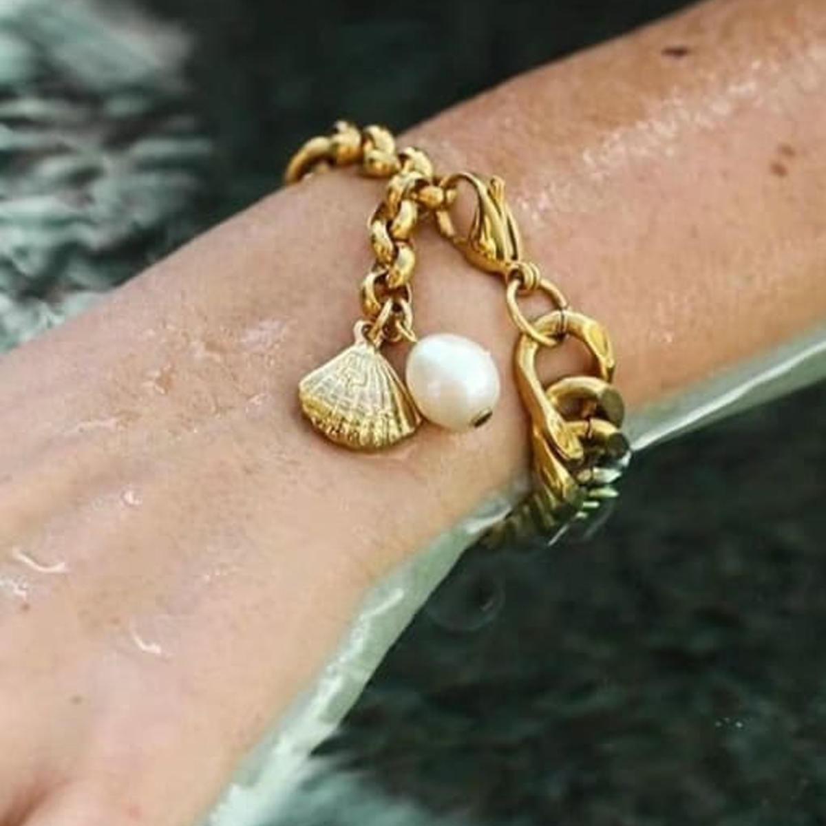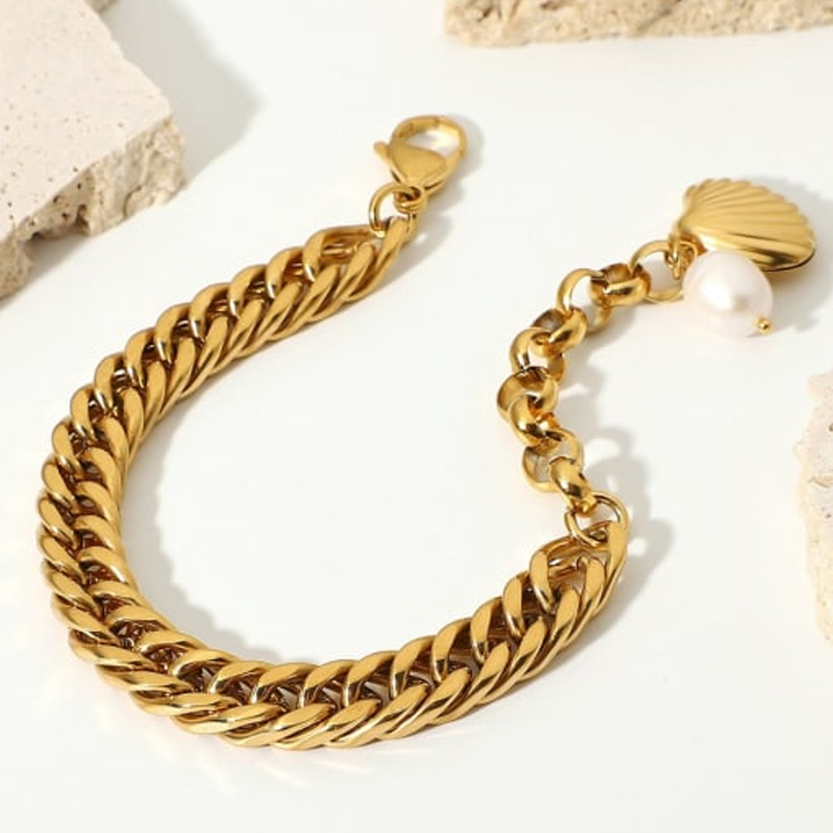 Μια αλυσίδα ταυτότητας βασιλική, βαριά, πολύτιμη όσο και το μαργαριτάρι που κουβαλάει μαζί της. Ένα βραχιόλι για τις βασίλισσες του Σαβά, από επίχρυσο ανοξείδωτο ατσάλι, με ένα μαργαριτάρι του γλυκού νερού και ένα κοχύλι για γούρι.
